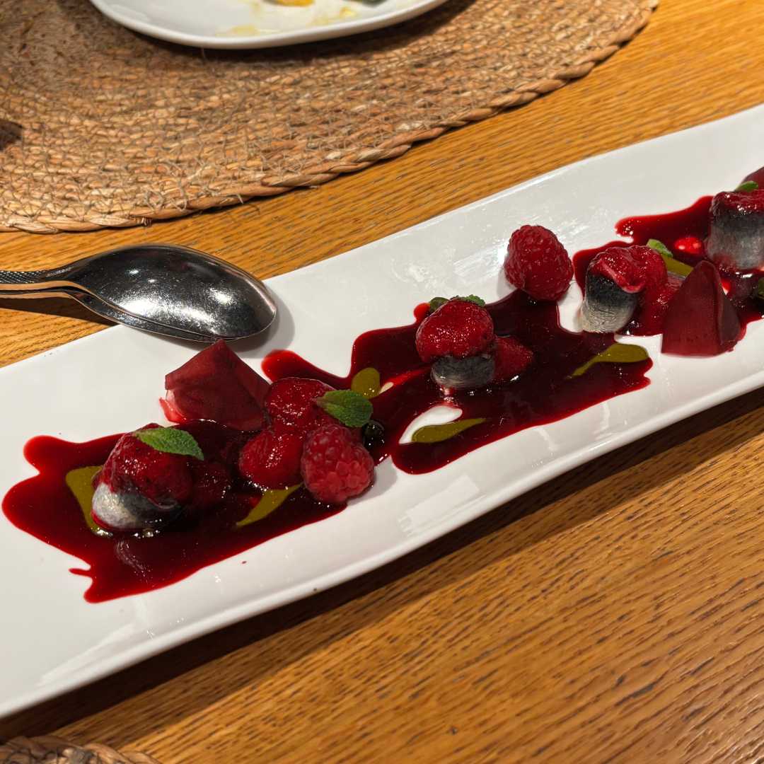 We continued with the Marinated sardines with raspberries, beetroot, and pistachio (Sardinas marinadas con frambuesas, remolacha y pistacho). The colors were striking; the portion size was small for our table of three, but the flavor was spot on.