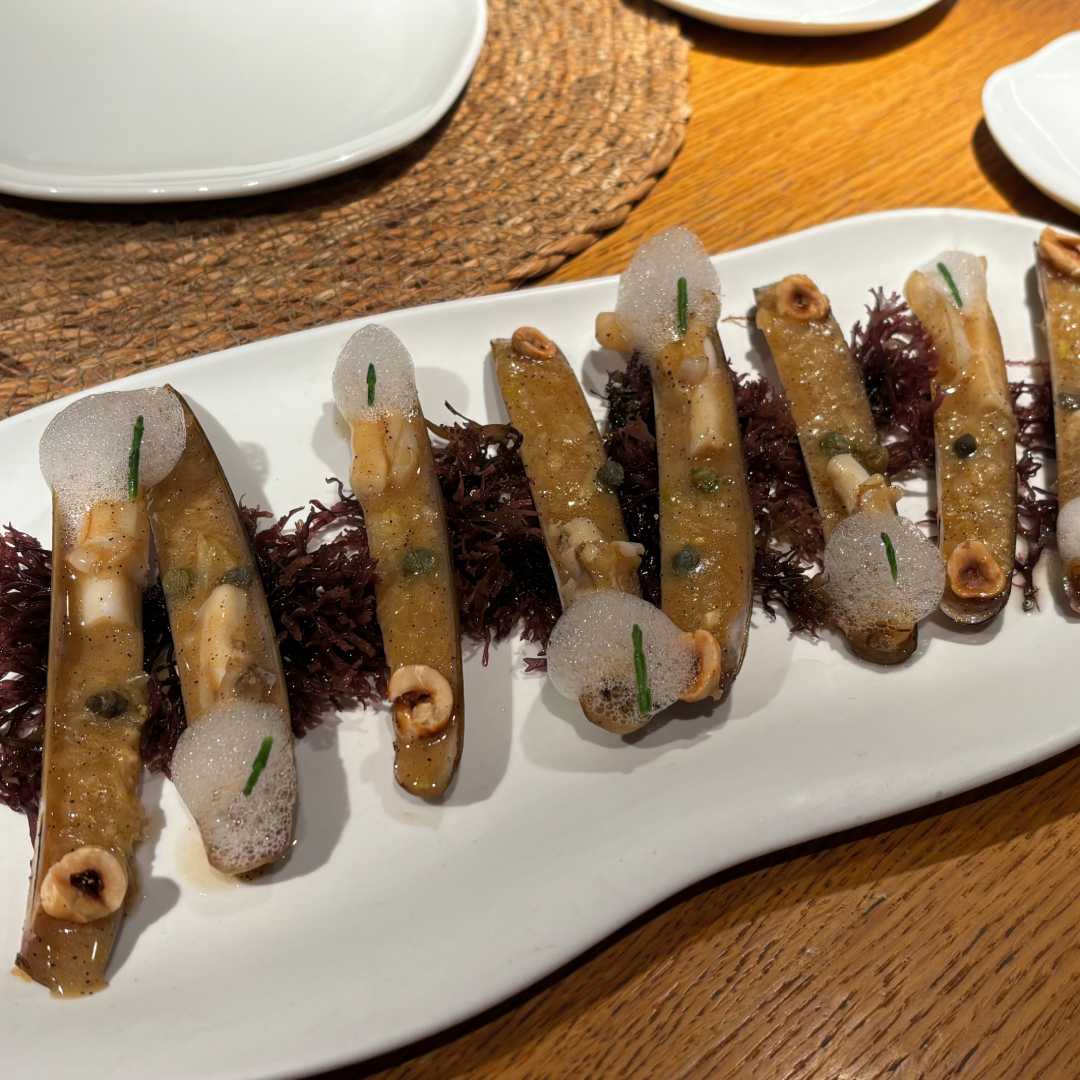 For me, that dish was named Navajas. Navajas con hinojo y salsa meunière (Razor clams with fennel and Meunière sauce).