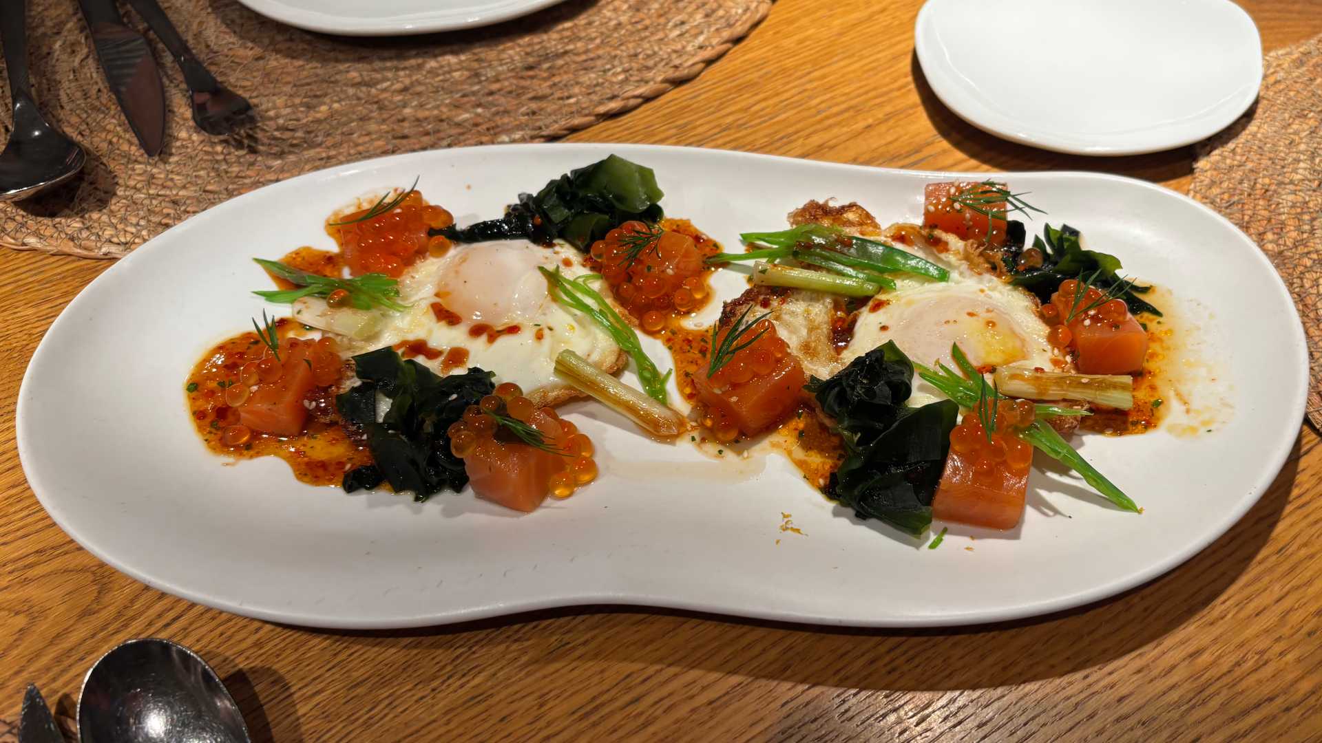 The Fried eggs with marinated salmon, wakame, and citrus vinaigrette (Huevos fritos ilustrados con salmón marinado, wakame y vinagreta cítrica), a creative and very successful version of the fried egg—a classic of Catalan cuisine—was our last stop before the main courses. After eating the first piece of salmon, I looked at the rest of the plate and thought: what is this? Is there more? Fortunately, my other friends were not as gluttonous as I was, and I had more than I needed.