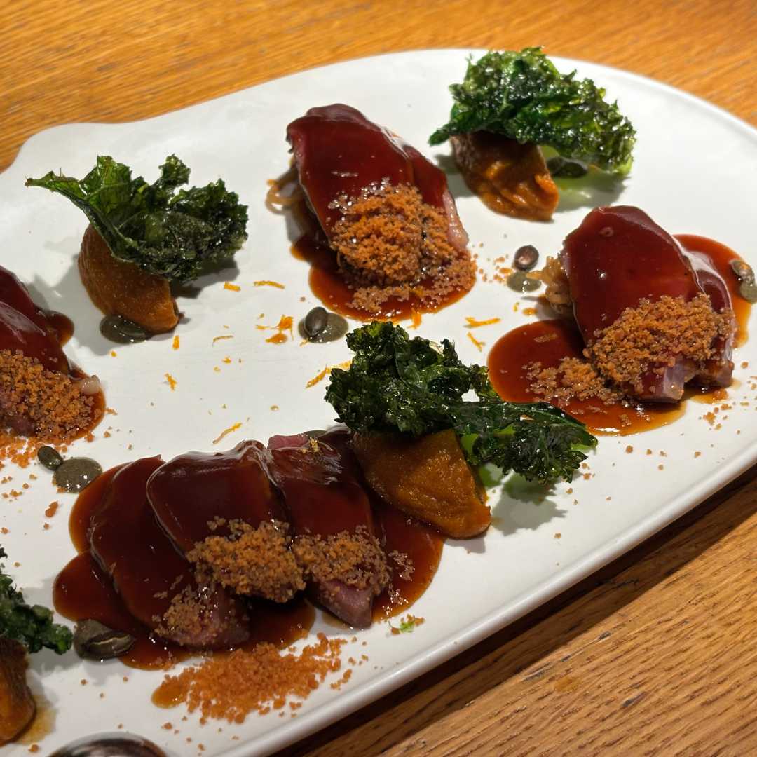 The final dish, unfortunately, was the only inadequate one. We did not like it and we left it. No, not because we were full or because we were late—definitely not. The Rested duck magret with pumpkin puree and kale (Magret de pato reposado con puré de calabaza y kale) truly became the last one when it lacked crispy skin and the inside felt rubbery.